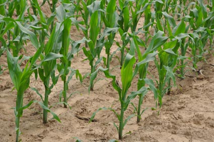 玉米的底肥必须施足磷和钾。根据科学家测定玉米一生当中,幼苗期只需要总氮量的5%,苗期只需要只氮量的25%,而穗粒期则需要总氮量的70%,也就是说从大喇叭口期开始,以拔节为标志,拔节前只需要总氮量的30%,而拔节后需要总氮量的70%,所以我们必须改变一炮轰的施肥方法,避免氮肥“前多后少”。用磷酸二铵和硫酸钾做底肥,用尿素做追肥,追肥必须在大喇叭口时追一次,在抽雄(穿红缨)时再追第二次。根据畅丰3号的需肥特点若要想得到亩(667平方米)产量1500斤~1800斤(干粮),一亩地必须施45斤磷酸二铵,15斤氯化钾,拔节前(大喇叭口期)约11~13片叶时,亩施尿素25斤加20斤缓施尿素,施肥后及时浇水,开花期灌透增粮水。
