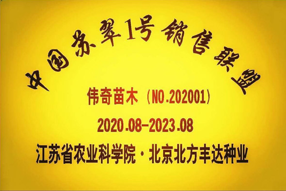 “苏翠1号”由江苏省农业科学院果树所培育,2017年5月1日获得植物新品种权证书(品种权编号CNA20121041.1),产权单位为江苏省农业科学院。江苏省农业科学院将“苏翠1号” 自获得植物新品种权起,至2037年4月30日止国内(港澳台除外)100%的市场开发权,及侵权维权、赔偿权全部转让给北京北方丰达种业有限责任公司享有。我公司本着少而精,质量为上的原则,让生产、繁殖、销售“苏翠1号”的同仁均有丰厚利润保障的前提下,联合国内有实力、讲诚信的苗木生产销售商户,成立“中国苏翠1号销售联盟”,全国仅招募16家(含本公司)有实力、讲诚信的苗木生产经销商户入盟,本联盟将对“苏翠1号”进行有序、有计划的发展与推广。我们计划未来10年让“苏翠1号”在其优势种植区的黄淮地区推广面积达到100万亩,并制定“苏翠1号”销售盟约,约束每位入盟商户,最终达到苗木经销商、建园果农、苏翠1号果品销售商户等三方共赢的目的,让“苏翠1号”这一优秀品种为社会持续创造更大财富!