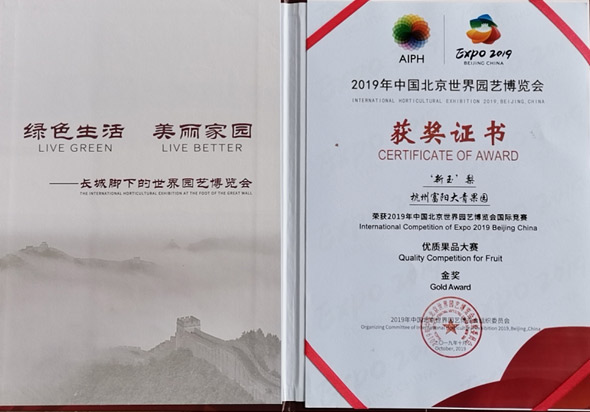 2019年8月1日,2019北京世界园艺博览会优质果品大赛颁奖仪式在世园会百果园内举行,本次大赛采用“盲评”方式,评委公平公正地分别从果品外观、内在品质等方面对梨、桃、葡萄、苹果、李、杏等11个品类96个合格样品进行评审打分,以全体评委评分的平均分作为果品的最终得分。本次评审最终评出金奖11个、银奖18个、铜奖29个、优秀奖38个。杭州富阳大青果园选送的浙江省农业科学院施泽彬研究员培育的“新玉”早蜜梨,在本次大赛中荣获梨唯一金奖。